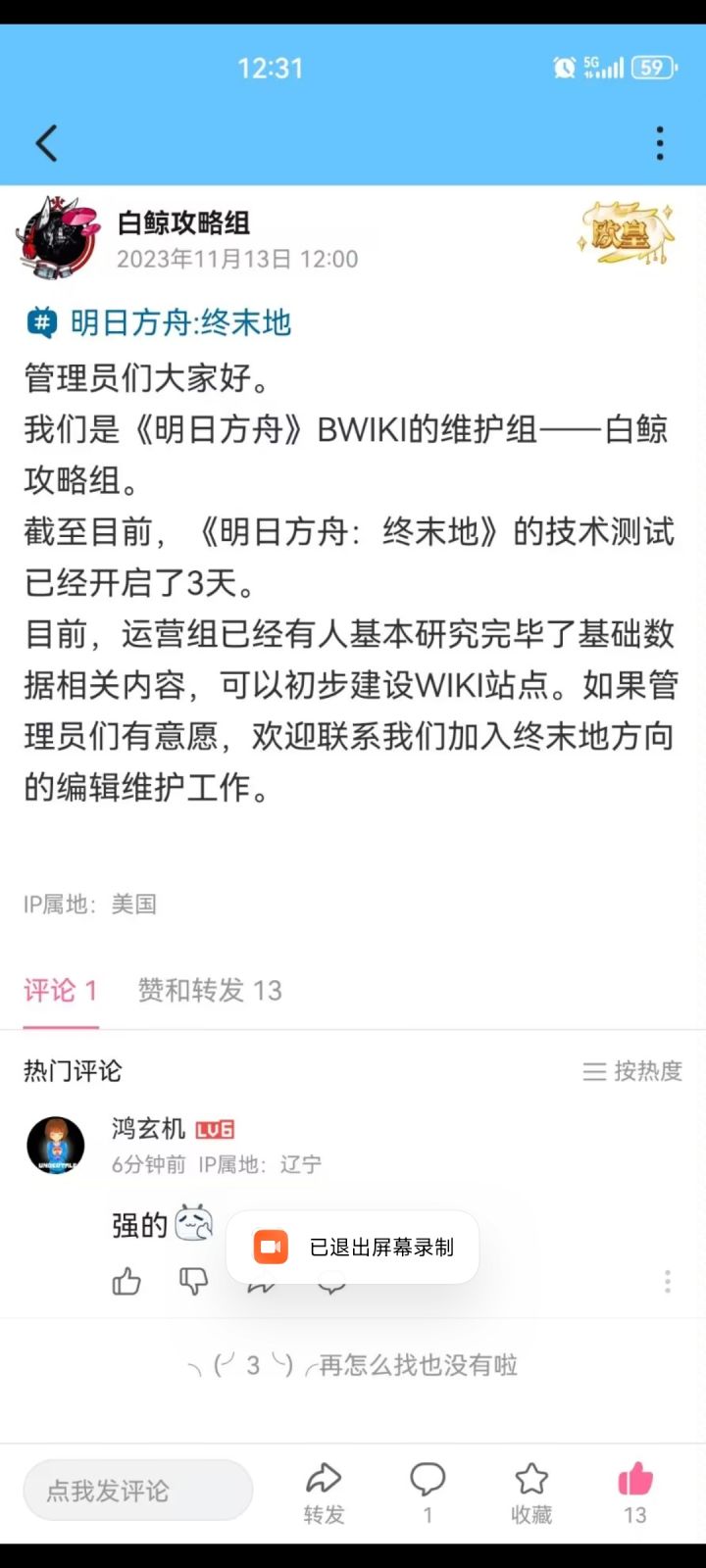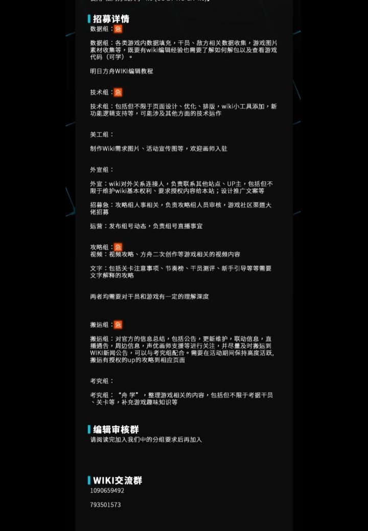 管理员们大家好。我们是《明日方舟》BWIKI的维护组——白鲸攻略组。截至目前,《明日方舟:终末地》的技术测试已经开启了3天。目前,运营组已经有人基本研究完毕了基础数据相关内容,可以初步建设WIKI站点。如果管理员们有意愿,欢迎联系我们加入终末地方向的编辑维护工作。#2023感谢庆典#明日方舟:终末地#明日方舟#wiki