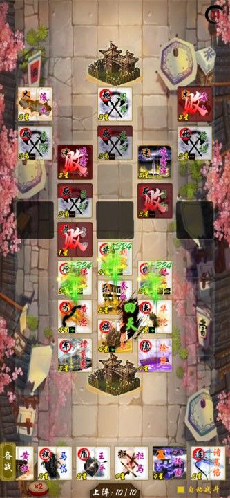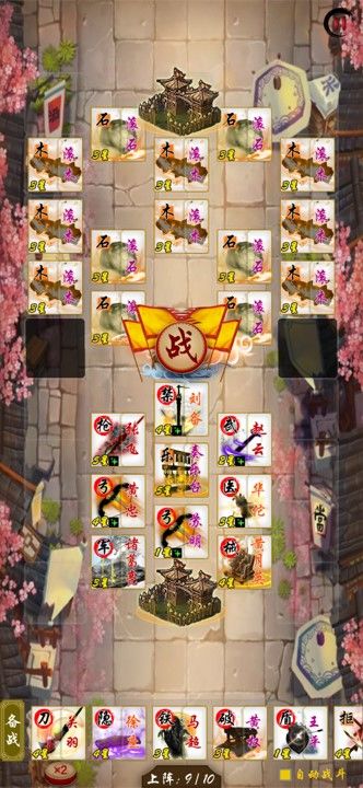 这样布阵可以最大发挥奏乐台的效果,而且刘备和赵云的血量很高,适合作为前排。建议不要在前期上关羽,关羽的攻击机制真的太容易被雷炸死了。