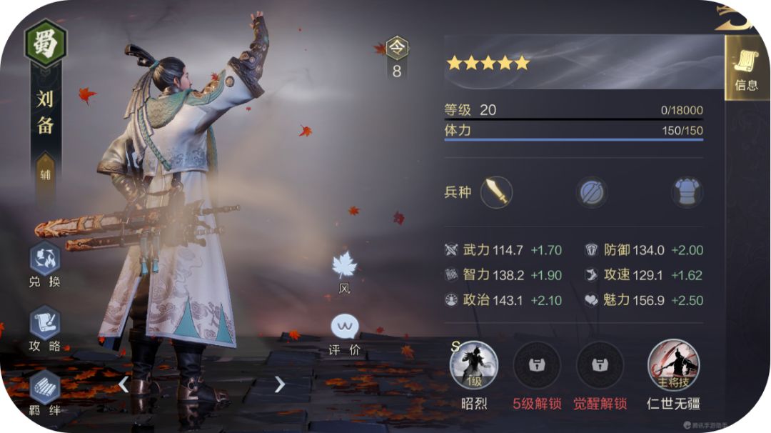 刘备:武将自带技能“昭烈”:全体减伤30秒,并且提升两名武力将的武力输出30秒。