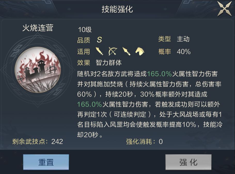 如果缺少技能但阵容齐全,还可以适当选择【低配】版本的“嘟嘟队”。比如陆逊可以携带黄月英的拆机【烈火燎原】、刘表的拆技【乘间击瑕】等,这些武技都是名望任务中会赠送的武技,获取难度较低,适合平民玩家。