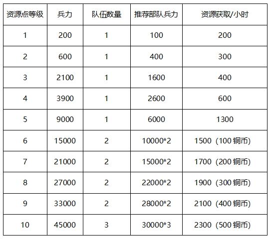 第1赛季资源地分为10级,资源地守军强度,获取资源量如下。随着资源点的等级提升,攻占资源点所需要的兵力也同步上升。小编给出了推荐攻占兵力需要。其中,村落守军比起其他资源地守军属性更高,难度接近于下一级资源地。