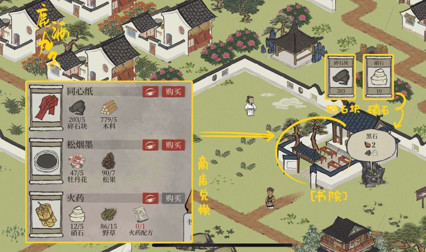 [书院]兑换——[同心纸]、[松烟墨]、[火药]