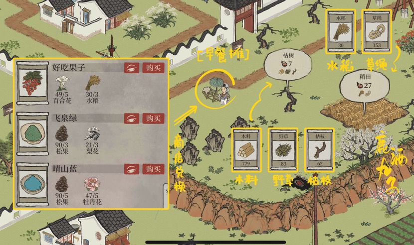 [早餐摊]兑换——[好吃果子]、[飞泉绿]、[晴山蓝]