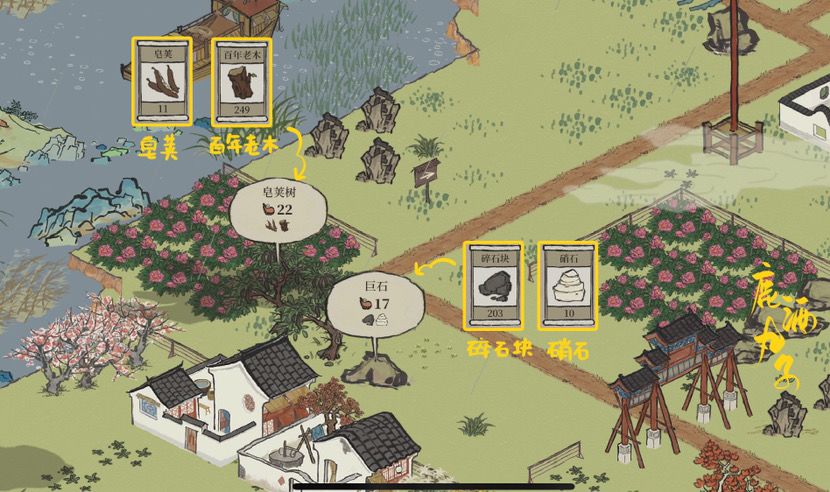 [铁钉]、[铁矿石]、[枫叶]、[草绳]、[野草]、[梨花]、[天然棉]、[野猪肉]、[牡丹花]、[百合花]、[杜鹃花]、[木料]、[水稻]、[枯枝]、[皂荚]、[松果]、[百年老木]、[硝石]、[碎石块]