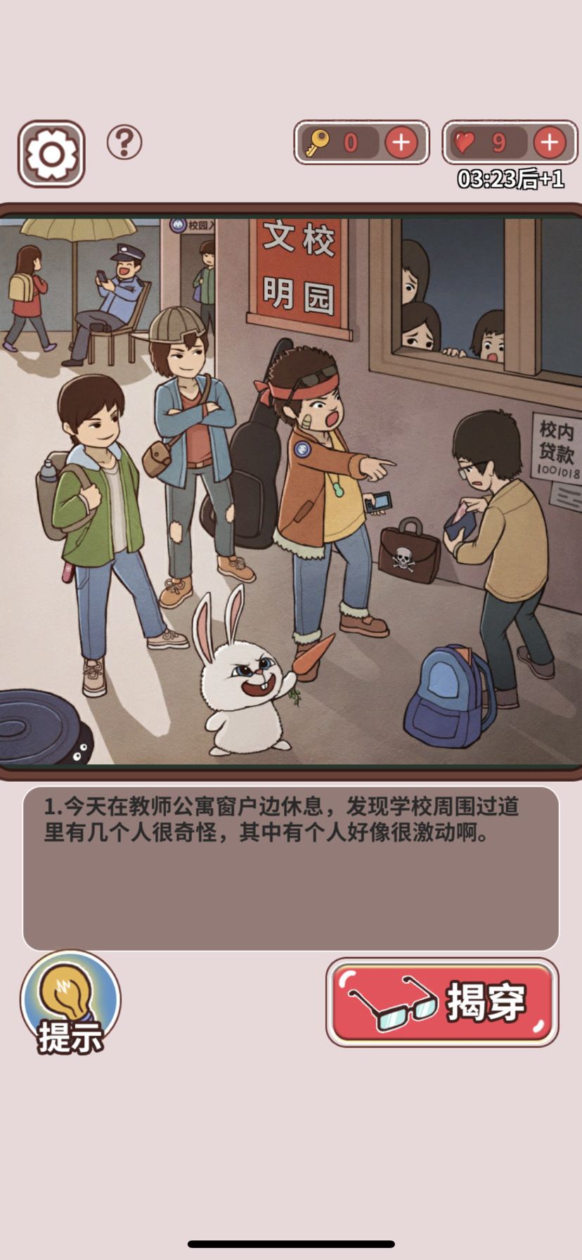 不知道这个图到底是谁画的?是谁构思的真的真的非常棒。校园欺凌不仅仅是欺凌方和被欺凌方两个人的事情。还有校园内保安的问题,比如图中这个保安他就是玩忽职守,还有校园内其他同学的问题,你看窗户里面有很多学生在袖手旁观,他们发现了这个事情也不会去找老师或者是找保安去举报,来保护这个被欺凌的同学,而是躲在那里事不关己高高挂起,也许这是他们茶余饭后的谈资,他们就是不会挺身而出。真的,我感觉这个游戏的美术这个游戏的策划,这个游戏的一切的一切真的都非常的符合现实,很能,反映出社会问题,我会一直把这个游戏玩下去的。