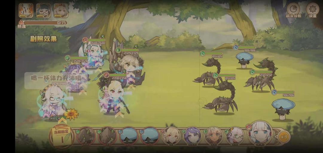 虽然本局战斗看上去是碾压,但是思路是可以展现的:我让可以上火伤buff的葛夜先攻,让同为火系的巴风特在时间轴的后面,是为了让巴风特能够享受到火系易伤的影响。同理,我的第二步是治疗胡桃。这样的目的是让她可以先第三波先于怪物放大招治疗。