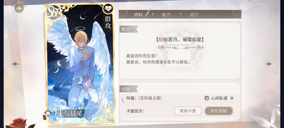 3 路辰的关键词,晨星。万圣那张卡又是晨星又是天使,说的还是[晨星因何而坠落?]而路西法在堕天前曾也是“光耀的晨星”,虽然说法不太经得起考据但是!这个人设一旦对应起来真的非常带感!所以路辰在PV里的???,也许指代的是一个类似神或者天使的词?或者就干脆相反,是一个有路西法的含义的词。