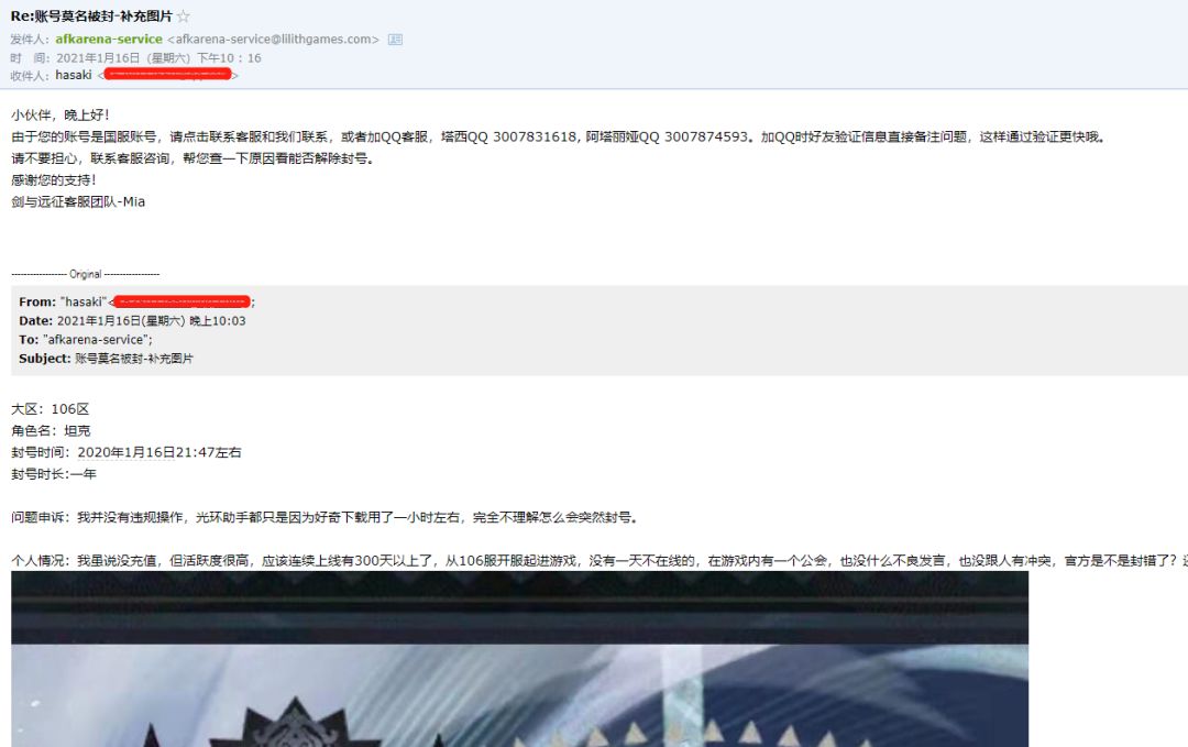 因为不想加QQ,想发个邮件把问题说清楚,官方邮件回复得倒算快,但并没有解决问题,而是说因为我是国服玩家,让我加QQ客服。
