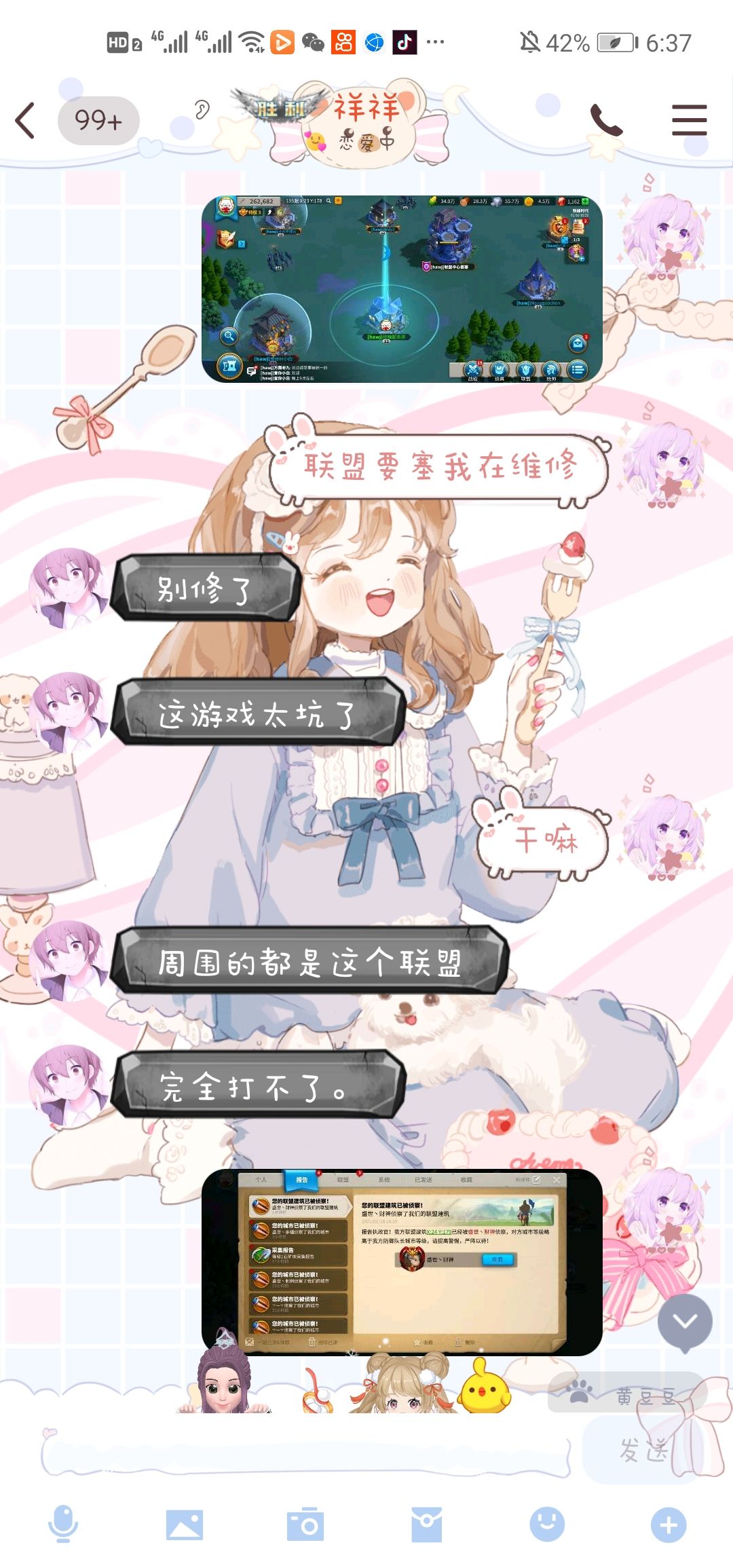 我朋友大号几百万战力的,弄了个小号和我一起玩,他大号加入别的联盟,小号自己建了个联盟,还没建多久就被打了= =要塞就被打的冒火了,我还在维修,朋友直接就被气的退坑了,莉莉丝长点心吧,你这样还有微氪中氪玩家玩么?