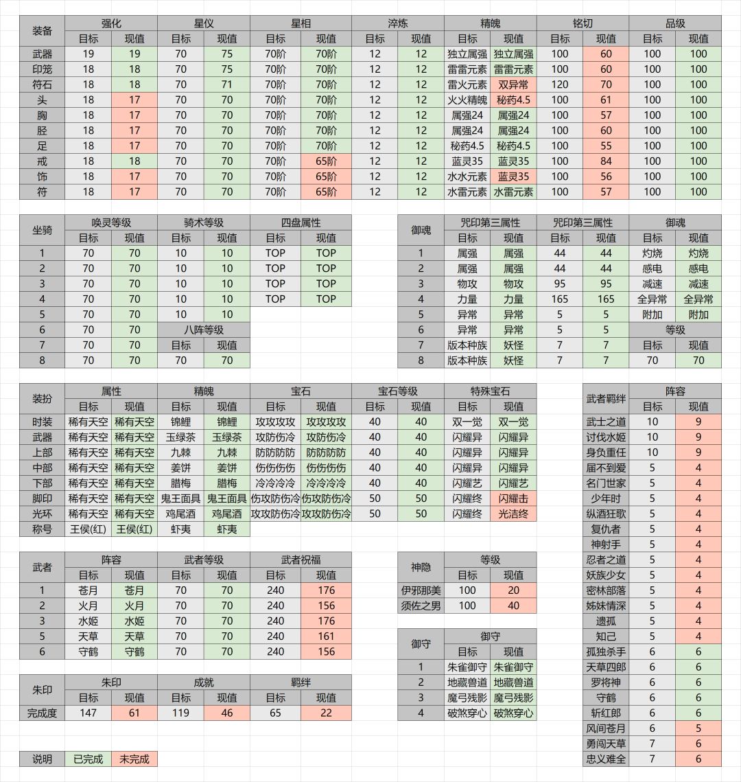 我有个表格记录了所有的打造细节,并且对照完成度。