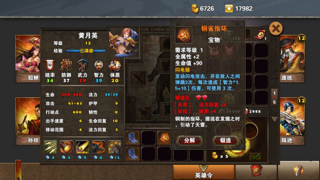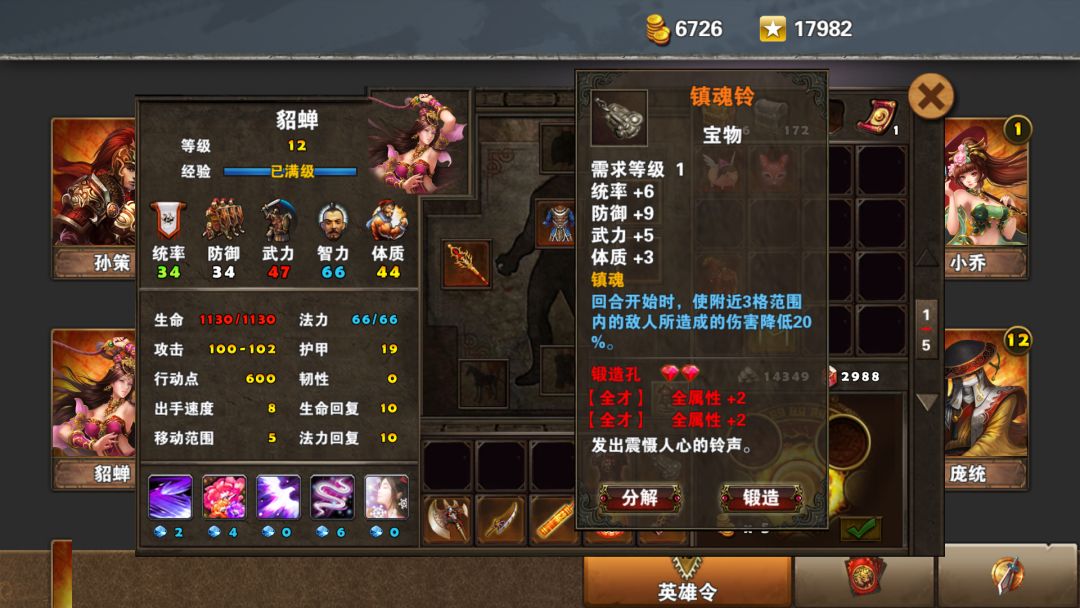 镇魂铃,6统9防5武3体,特效每回合初降低3格范围内敌人20%攻。产出于华容道。