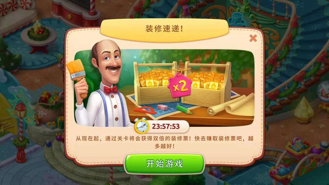 时间是从你上线直接开始的(24个小时)这个时间内通过关卡就会获得双倍装修票。抓住这个时间可以比平时省一半的装修票!