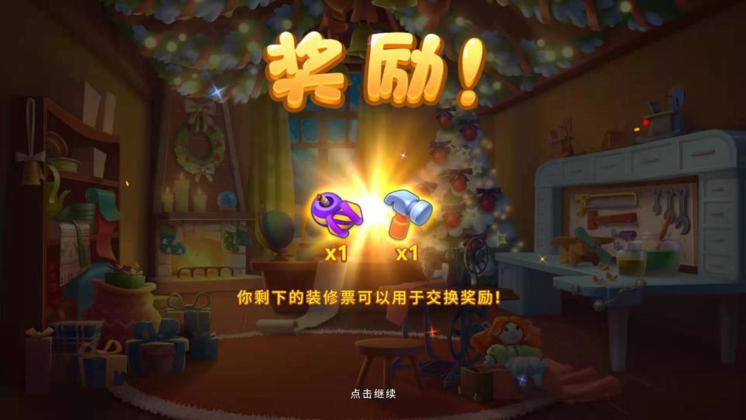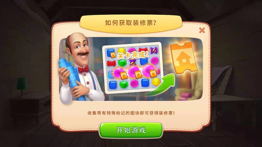 收集关卡内带有特殊标记的图块即可获得装修票,收集的越多获得的也越多,多多闯关哦!