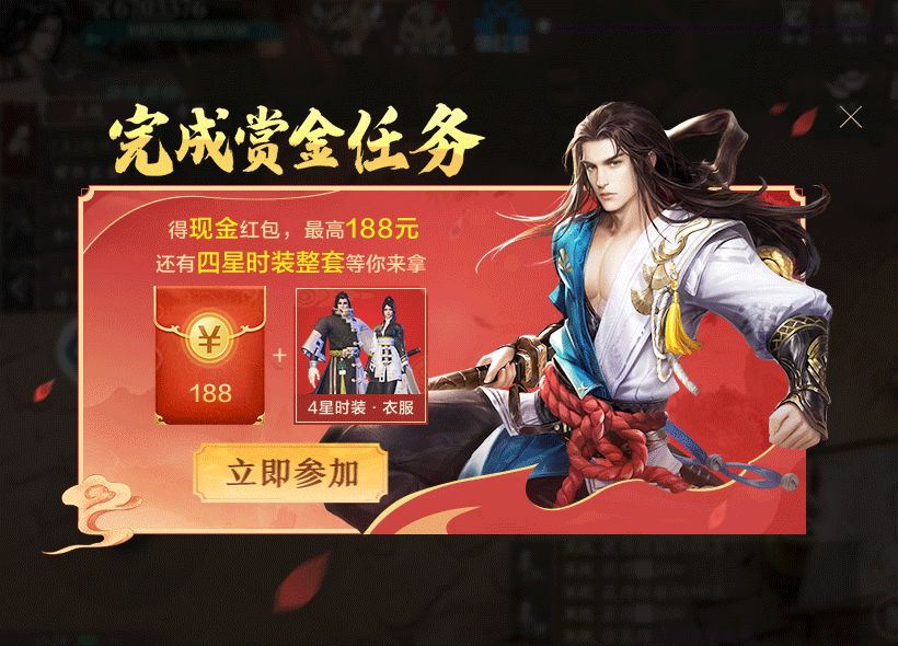 完成赏金任务,必得现金红包!参与【领红包】活动,邀请好友加入队伍,最高可领取188元现金红包!更有专属永久时装·穹宫神铭,元宝奉上!