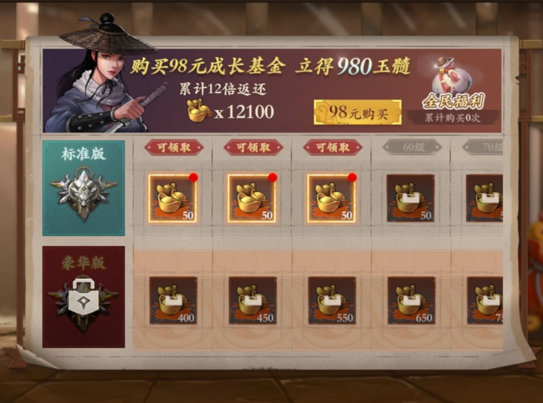 成长基金,养成快人一步!购买98元立得980玉髓,更有累计12倍奖励返还!全民福利BUFF开启,快来购买解锁成长基金吧!