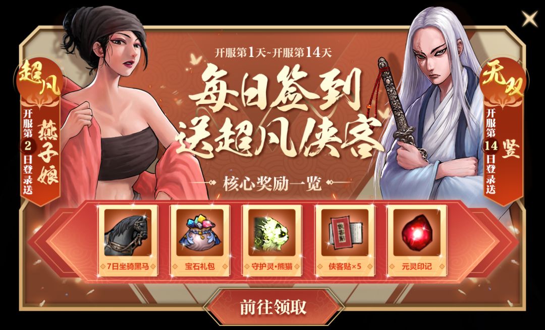 玩家每日登录签到可获得:超凡侠客·燕子娘,守护灵·熊猫、7日黑马坐骑等稀有道具! 连续签到14日,还可获得无双侠客·竖!