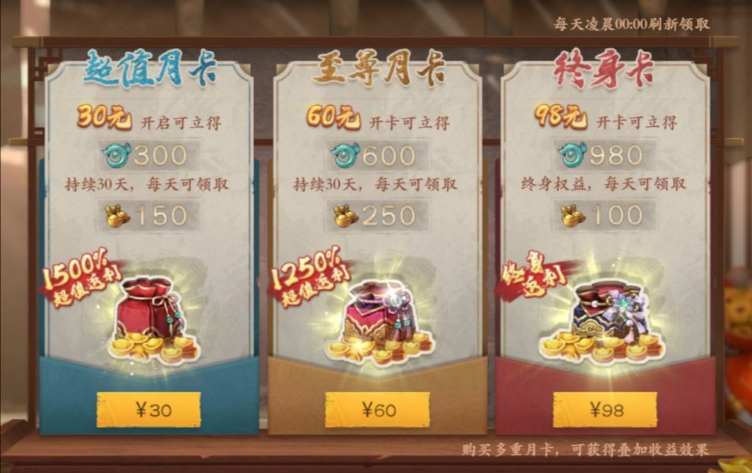 三重月卡任你选,多倍收益拿不停,购买即得1500%豪华返利,开通终身卡更有终身返利伴你成长!