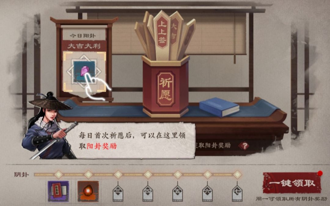 每日登录可获得一次占卜机会,玩家占卜后可获得阳卦、阴卦奖励,阳卦奖励可立即领取,阴卦奖励需每周一统一领取,且有概率开出超凡侠客、抽卡券、完美元灵印记等稀有奖励!