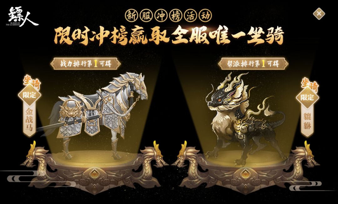 活动期间,玩家在等级、战力、侠客、装备、玄兵、守护灵、帮派任一排行榜上进入前20名即可获得丰厚的排名奖励,全服战力排名第一更可获得专属坐骑“金云”!镖客大人快来冲榜吧!