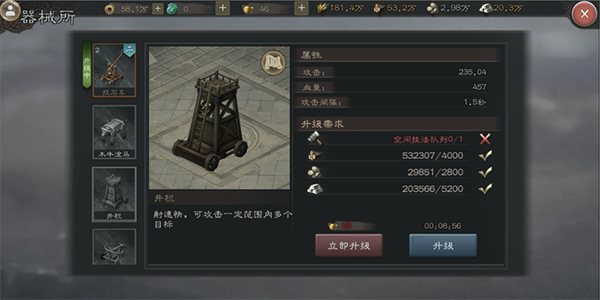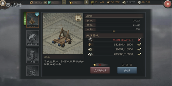 在《三国志威力无双》之中,器械的作用同样不可忽视。在器械所中,各位主公共有6种器械可以选择,功能之间各有特色。大家选择的核心在于,根据情况选择合适的器械。例如,在攻城的阶段,投石车的作用基本高于其他任何器械,其原因便在于能够对墙体造成额外伤害。而到了巷战之中,投石车的作用便大不如前,选择井栏对多目标快速攻击,以此来获得最大化的收益。