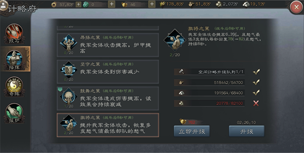 指挥的优势在于,武将输出能力越高提升越大,这样就能将阵容的输出能力再度提升一个档次。在所有的五个指挥计略中,激将之策的作用性最突出,能够提升全体攻击力并回复怒气,阿蝉也建议大家将这个计略升到满级。