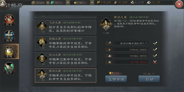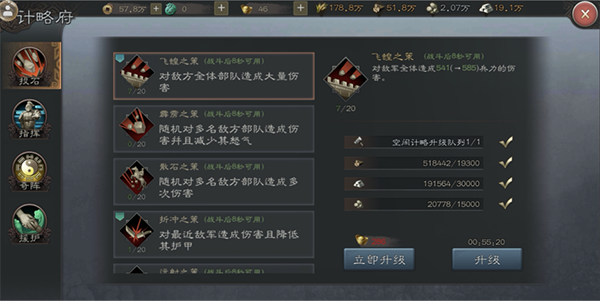 在计略府,计略共分为投石、指挥、奇阵、援护四大种类,而效果则相对应给敌军造成伤害、提高我方伤害、造成控制效果、回复己方生命值。四种计略之间优势各有千秋,各位主公搭配的核心要点就是弥补自身阵容的缺陷,例如说阵容仅有一个辅助和控制,那么则选择奇阵和援护。当然啦,若大家阵容已经非常完善,阿蝉建议选择使用指挥与奇阵。