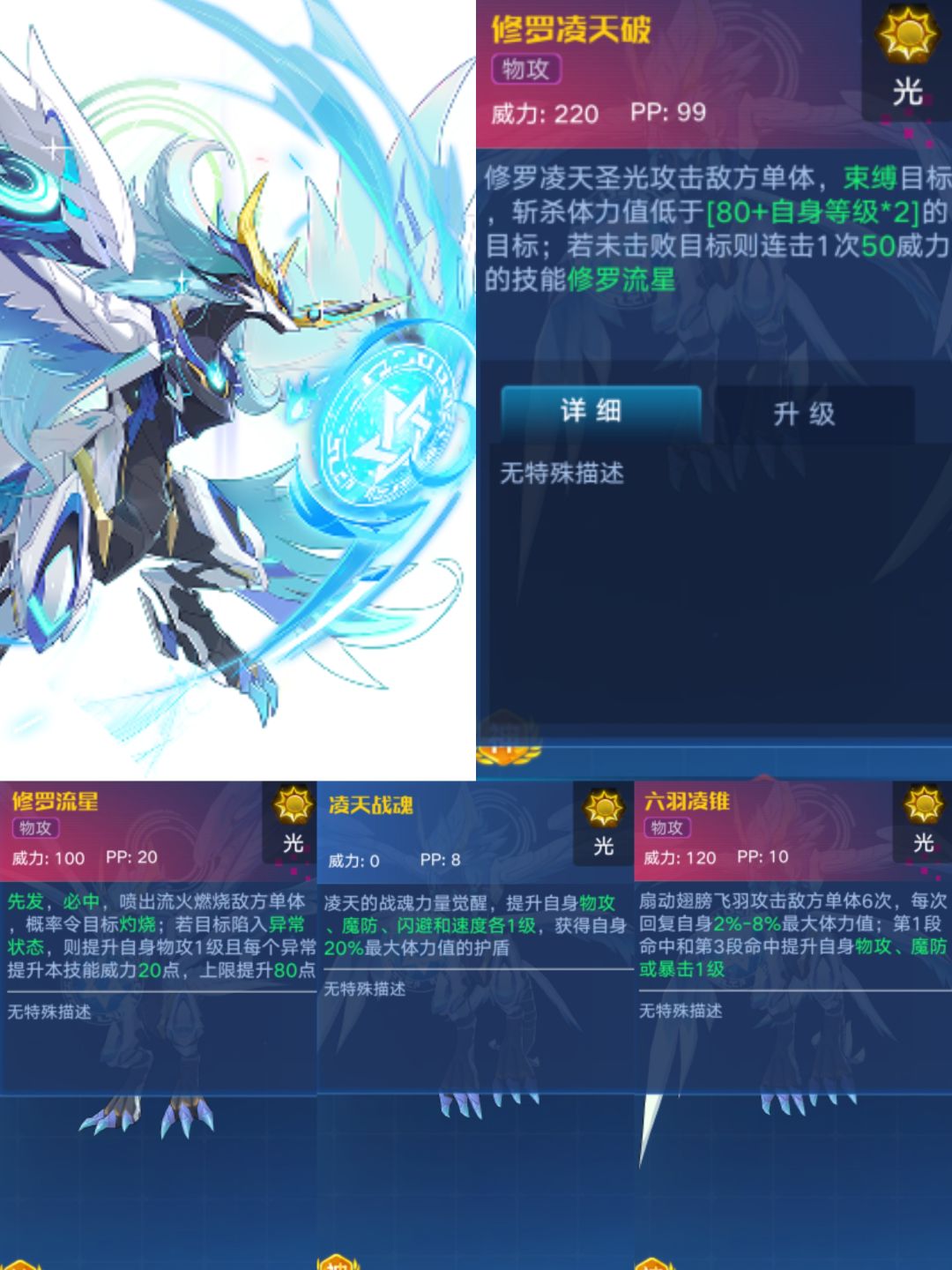 使用介绍:一如既往,修罗没有什么亮点,斩杀效果PVP确实不错,但是PVP却很难有它的位置,他能打的机械系零能天使,大招能秒杀,他不能打的帝俊,因为特性原因依旧没有任何能反抗的能力该被拍死还是拍死,而且凌天修罗的速度是完全可以担任首发位置的,却因为这个奇奇怪怪但特性必须有六个回合是没有特性空过的,PVE的话,新时代没有能承载超进化的船,现在的PVE都是被逆时空和晶石亚比还有一些本就是PVE老牌的强宠垄断,emmmmmmm,看官方是否会进行调整了。