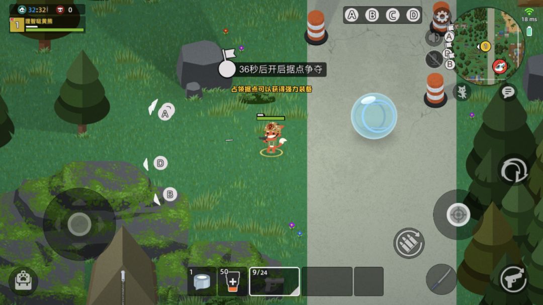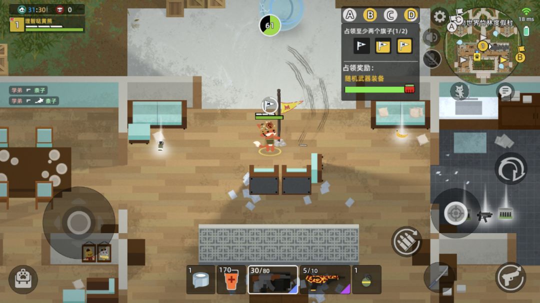 此模式玩法各位小可爱们将会被分为两个阵营进行战斗,每个阵营32只小动物。各位小动物将从固定出生点出生,每方有三个出生点,分布在地图两侧。地图上将会随机出现4个点位,争夺点位会获得高级武器和道具,击败敌方所有小动物将获得胜利!
