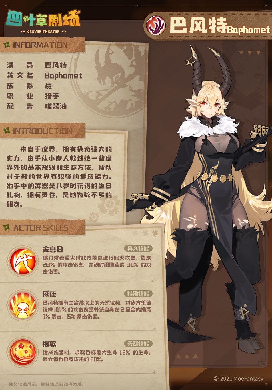 来自于魔界、拥有极为强大的实力,由于从小家人教过她一些魔界外的基本规则和生存方法,所以对于新的世界有较强的适应能力。她手中的武器是八岁时获得的生日礼物,拥有灵性,是她为数不多的朋友。