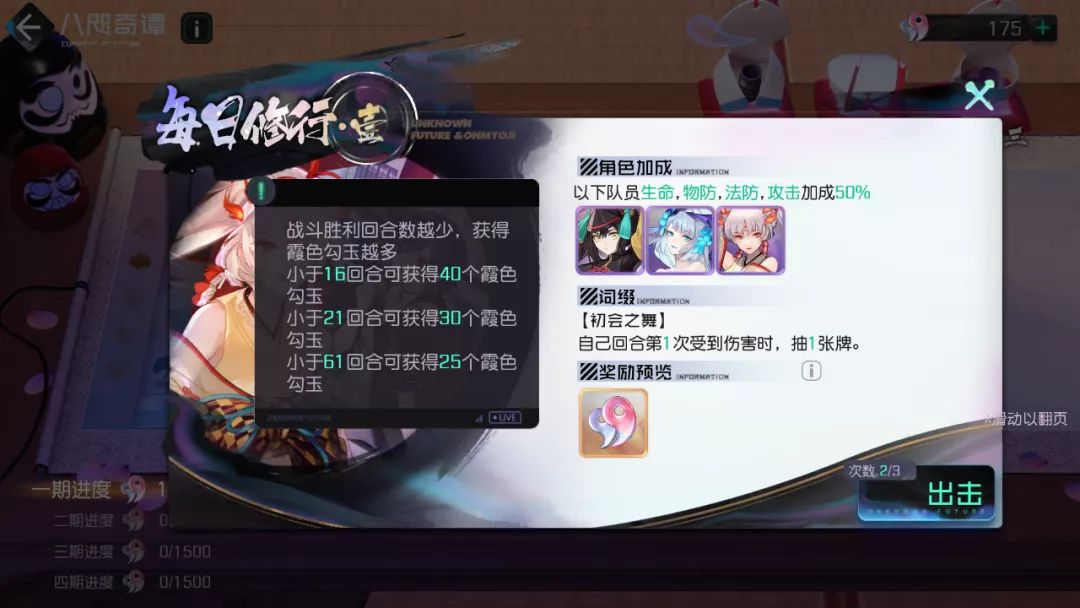修行:每日挑战,每天可以挑战三次,根据挑战的回合数发放霞色勾玉。
