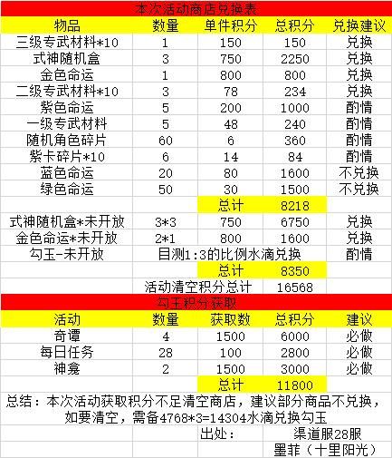 活动时间跨度将近一个月,搬空商店问题不大(不建议兑换的物品除外),日常肝度(PVP、剧情肝度高)一般。