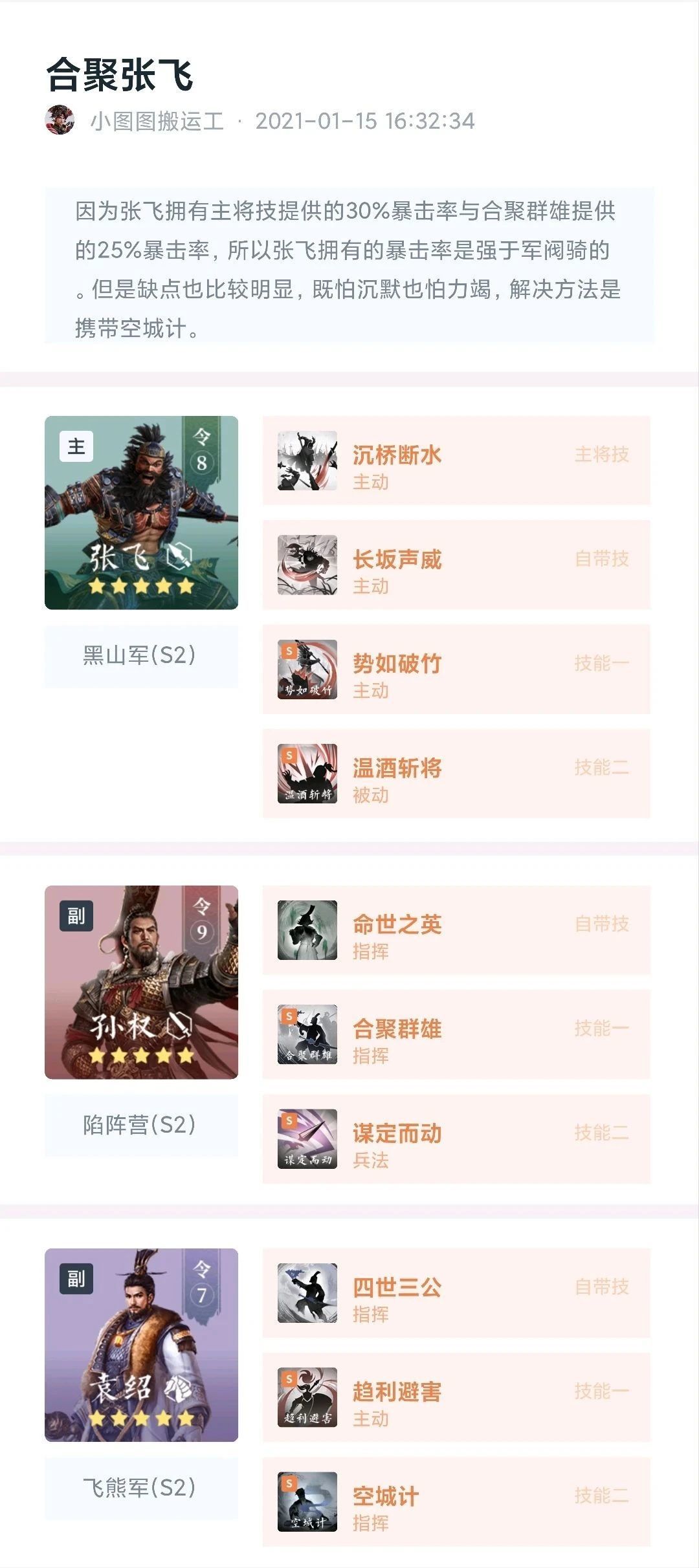因为张飞拥有主将技提供的30%暴击率与合聚群雄提供的25%暴击率,所以张飞拥有的暴击率是强于军阀骑的。但是缺点也比较明显,既怕沉默也怕力竭,解决方法是携带空城计。