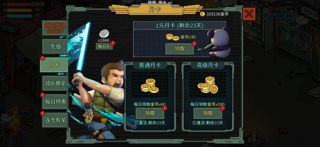 不管啥游戏,基本上月卡不超性价比最该的,但一定是比较高的那一批。所以对于我们微氪玩家来说,要氪金的最优先选择自然就是月卡。首先是主界面的金币月卡,1元月卡,每天可以领30个金币,一个月900个,跟正常比例1:10比起来,性价比不要太高!然后下面的普通月卡和高级月卡的性价比也很高,毕竟金币在像素危城是硬通货,建议购买~