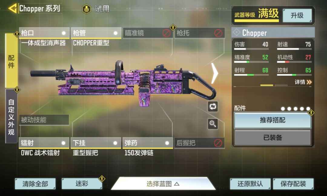 之前我在别人的视频中了解到,chopper只要加一个枪管,就能伤害持续不衰减,所以我加了一个Chopper重型枪管和一体成型消音器,来保持Chopper的伤害持续不衰减,OWC战术镭射,增加精准度,重型卧把,额我忘了……,150发,弹链,增加持久性,虽然损失了机动性,但不过别的地方的性能大大提升。