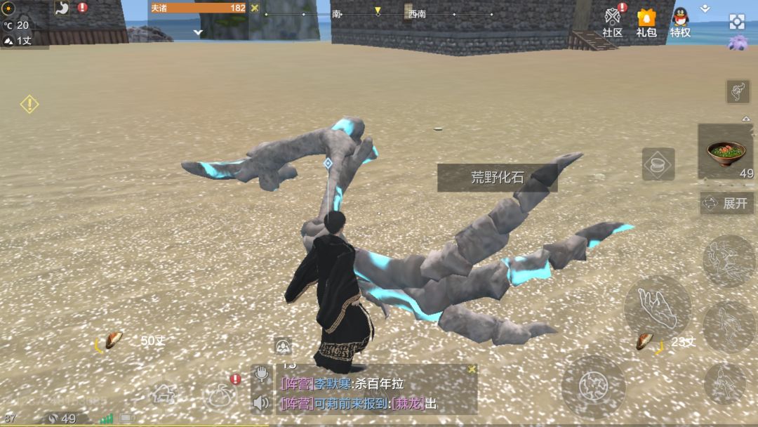 之后就可以去采集龙骨草了,有两个推荐地点,一个是中山雪地,一个是沙漠山坡。中山雪地龙骨草多一点,而且是平地,好跑,以及能够采集到冰晶拿来氏族捐献。缺点则是寒冷,饱食度消耗快,这个地方采集龙骨草只有1采集经验,而且很可能被别的大陆的玩家击杀。沙漠山坡(沙丘)的话,优点是一个龙骨草2经验,没有人来打扰。缺点是经常长在刁钻的地方,而且因为不是平地所以特别难跑,有时候还会被坐骑顶来顶去然后掉下坡爬不上来(气出脑梗)。