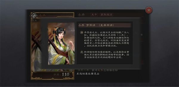 想必主公们都知道,资质是每一位武将先天形成的东西,不可改变。资质越高的武将,养成后的战力也就越出众。作为一名偏辅助型的智力武将,小乔的资质为110,初始智力为91,说明了小乔有着不俗的技能伤害,也足够主公们使用到后期。但是身为弓兵,小乔的身板是较脆的,骑兵近身之后“一碰就碎”!主公们切记将其放在队伍后排,远程提供输出以及辅助效果,防止敌方骑兵突进。小乔的技能为“惊鸿之舞”,能对敌军造成大额的计策伤害,更为重要的是,使敌人陷入长达5秒的眩晕,要知道一场对决持续时间不过数十秒,能极大增加队伍的取胜概率。倘若主公们队伍中缺少控制,小乔乃不二之选。