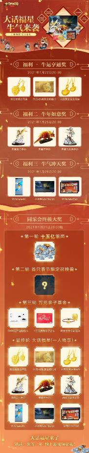 1月22日晚,全服将抽取牛运亨通奖,送出大话x邮政牛转乾坤明信片,黄金兽黄金吊坠,元宝黄金吊坠;1月25日晚,全服抽取牛年如意奖,送出典藏年手办,典藏龙马手办,典藏飞剑侠手办;1月28日晚,全服抽取牛气冲天奖,获奖的玩家将能够获得华为mate40 pro5,小米电视5 Pro 55,华为平板电脑MatePad 10.4英寸等奖品!