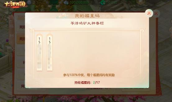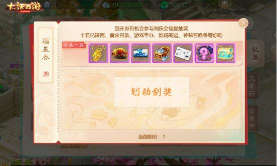 2021年1月21日08:00~2021年1月31日21:30期间,侠士们将背包内的福星券刮开,就有机会获得天降福星大奖。每张福星券可中奖一次,只要参与活动就100%能够获得奖励!大话将分三轮分别抽出三个福星大奖,获奖的玩家就能领取各种豪华实物好礼!