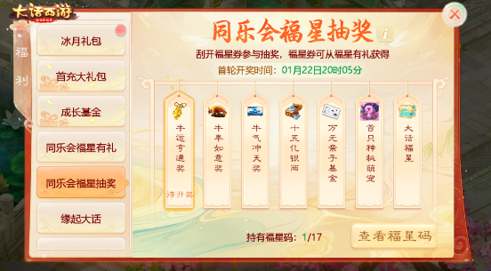 作为全体大话手游玩家们期待已久的新年盛会,今年的同乐会活动不仅将送出同乐会礼包、开启福星转盘等活动,也为侠士们准备了超豪华的实物奖励和各种游戏内惊喜好礼,等待集万千宠爱于一身的“大话福星”再度降临!