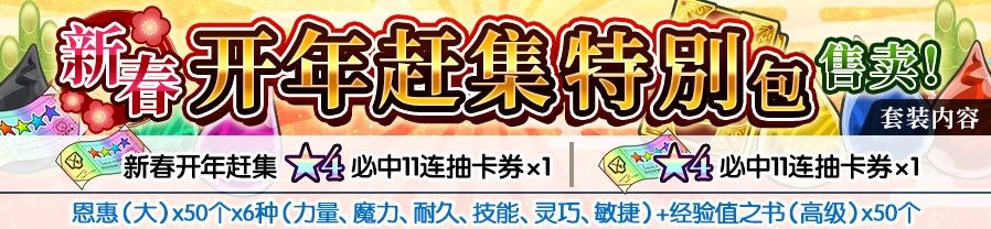 包含新春开年赶集★4必中11连抽卡券*1、★4必中11连抽卡券*1、恩惠(大)*50个*6种(力量、魔力、耐久、技能、灵巧、敏捷)、经验值之书(高级)*50个