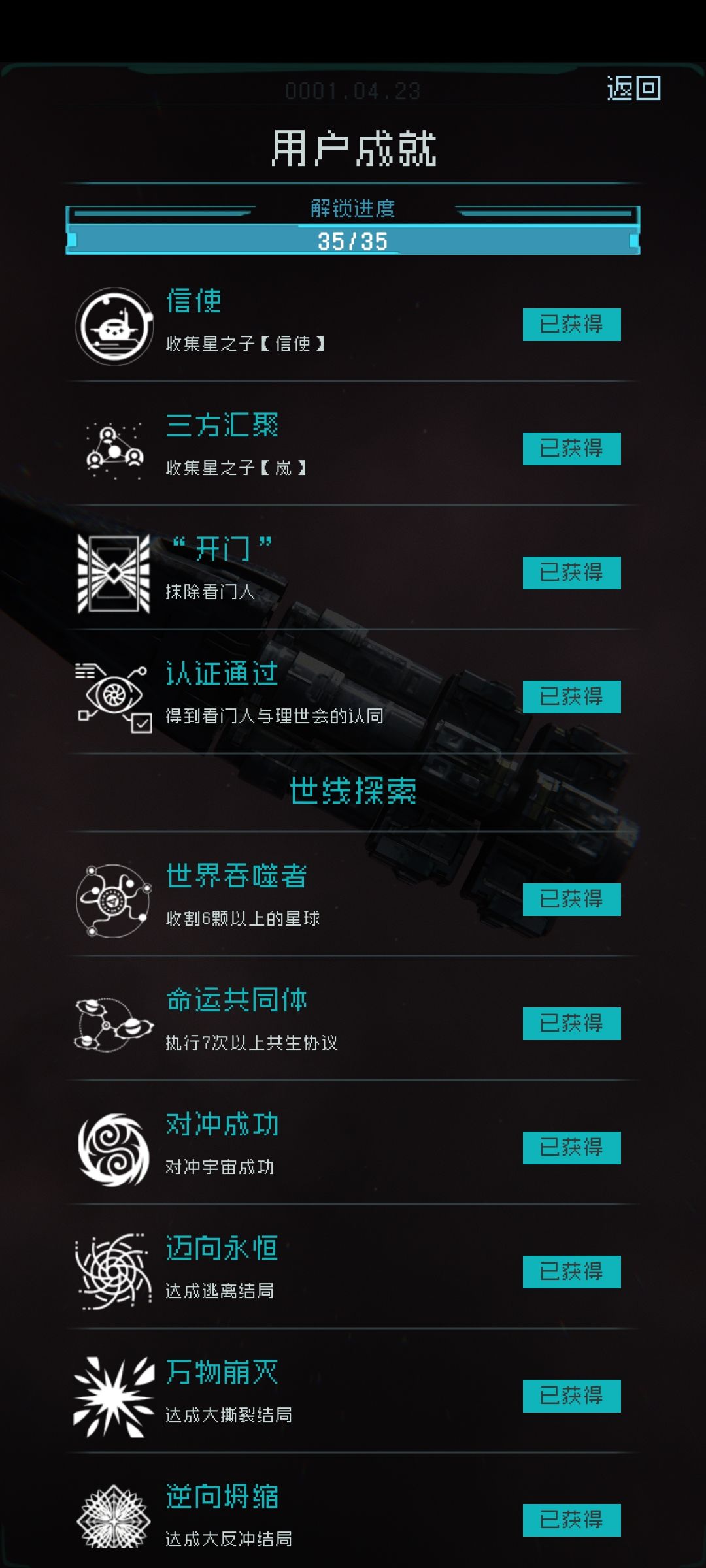 24. 星火意志! 我知道你好多人奔着这个来的,首先这是个彩蛋,本来不想说的,但是自己已经收集完全成就了就分享给你们吧。 条件:本文第七条 时间的秘密 你要触发完一次时间的秘密后不过关的情况下再触发一遍。(注意那个第二次时间回溯后七号星球简报打开里面才有执行者的信) (问答机:梅开二度,没想到吧)获得了这个成就我才看懂看门人这波日志