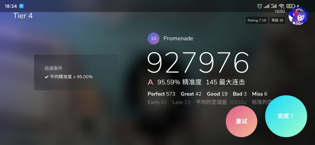 相比于打段位之前单摸的那把散步来说心慌肯定影响成绩了,就说慢速段刚过完我一连漏了三四个方键,血条直接一半没了,wok又漏一个...wok又....我心想,这不完蛋了,亏前面打这么好,然而实际上连想这个的时间都没有,只能专心看接下来出什么note,然后稍微稳定了一小会。然后出现双押之后我是又坏了几个click,那个时候的感觉感觉已经不能用心慌来形容了,整个身子都麻麻的特别是胸口,有点蹲久了之后的腿的感觉。一有这种感觉之后就更怕自己手抖就更慌,真的全程憋气,呼~直到最后的慢速段也过完,只剩下最后两个锁链,看着判定线消失,我往后一躺:这下终于轻松了