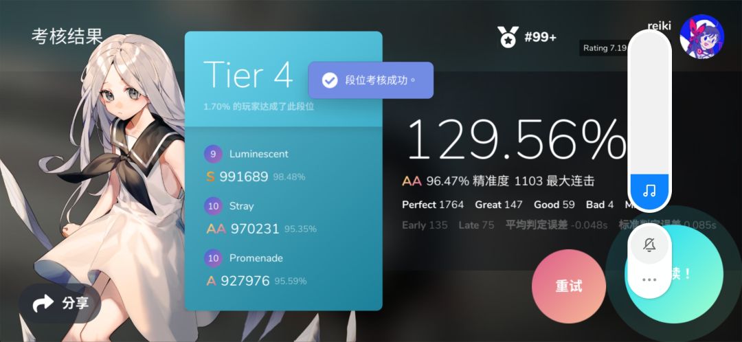 不过手感好也是真的。第一首全连诶~全连!全!~连!!打完98.5的准度就已经够我受的了(指心跳