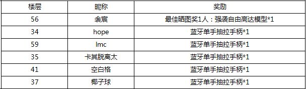 大家好,感谢大家积极的参与本次“《机动都市阿尔法》冲级晒战力 赢高达模型!”活动,现将活动中奖名单公布如下↓,没中奖的友友请不要气馁,多关注论坛最新活动公告,祝大家游戏愉快。