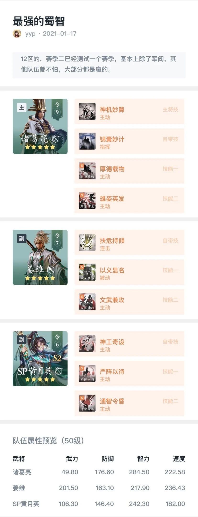 秃秃点评:类似于司马盾的法坦搭配方式,但更追求输出能力,主要依靠抵挡状态与盾阵来形成“盾”,义显姜维加上厚德诸葛能大幅提高姜维的承伤能力与恢复能力,配合姜维本身的武技特点,承伤能力并不输于曹仁等前排,并且自身还拥有不错的输出。黄月英负责偷取降低敌人智力,可增强自身武技的释放强度,并提高队友技能的伤害效率,队伍周期性的输出非常稳定,基本只被群势军阀这类极致追求开局爆发的队伍克制。