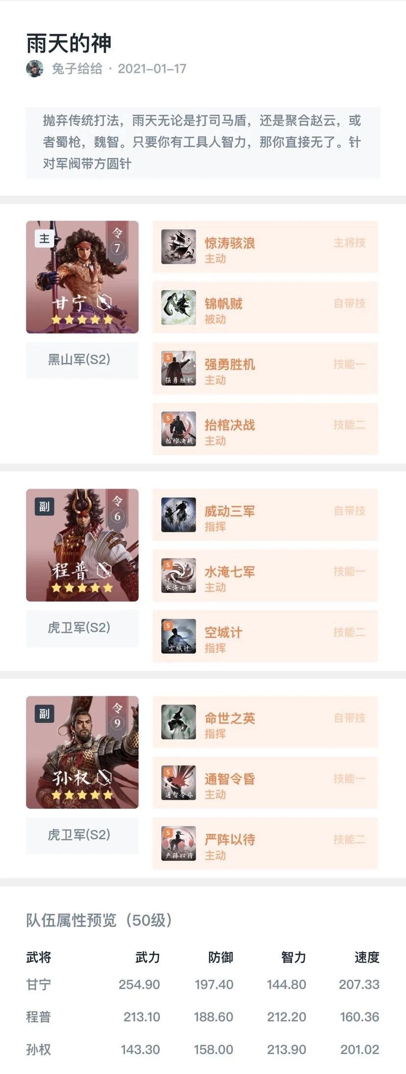 秃秃点评:摒弃S1中水鬼队的打法,利用水浸效果的覆盖与其他武技的联动提高队伍的伤害能力与控制能力,核心甘宁可获得明英加成、锦帆贼加成、雨天加成、国家加成、水浸目标加成、抬棺加成,周期爆发能力可达到非常惊人的地步,配合水浸稳定的持续伤害,容错率非常的高,同时队伍中拥有空城计、通智令昏这类强硬控制武技,能够很好的克制目前主流的主动队与连击队,除了军阀不是很吃这一套,绝大多数队伍都比较被该阵容克制。