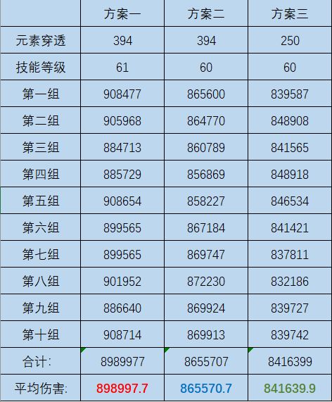 方案三60级技能伤害,元素穿透250,平均伤害为:841639.9