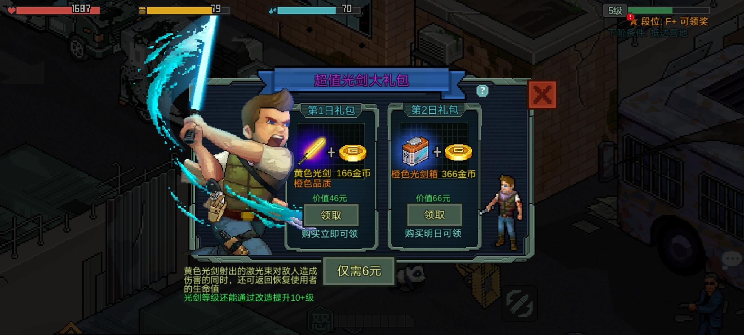 然后说里面的东西:“雨水”好像很鸡肋啊,虽然能补充水分但是还要减少四分之一的生命值。还有我一元钱买了个宠物熊猫,好像也没有什么用,纯粹好看。“激光剑”是个好东西,给你体验一下就又要骗氪了,6元钱,也不是太贵,但我盲猜后期基本放仓库吃灰。