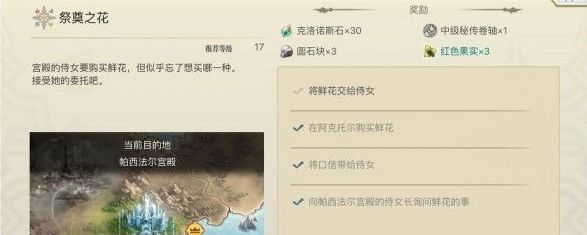 完成任务后就可以获得相应的任务奖励,其中包括了30个“克洛诺斯石”、1个“中级秘传卷轴”、3个“圆石块”和3个“红色果实”。