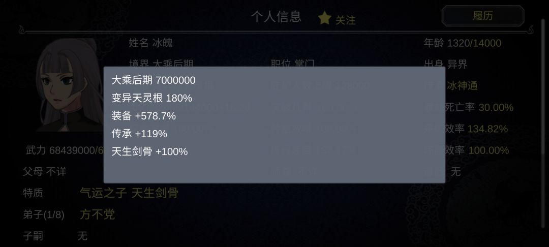 3. 掌门最好有天生剑体和加武力神通还要有龙/凤之力,最后还要一把极高武力的兵器。(才能挡住各种浪蝶狂蜂,手持一把500%+武力的兵器看谁敢来抢人)